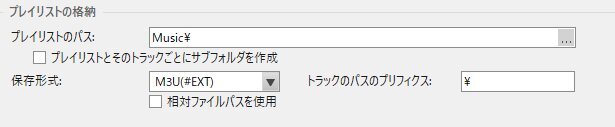 にして、保存形式を「M3U(#EXT)」に変更、トラックパスのプリフィクスは「\」とする。